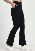 The regular fit combined with the flared bell bottom cut creates a flattering and balanced look for all body types. These lowers sit comfortably at a mid to high rise, giving your waist the perfect contour while providing core support without feeling tight or restrictive. The design smoothens your overall shape while ensuring your legs look long, lean, and gracefully structured.